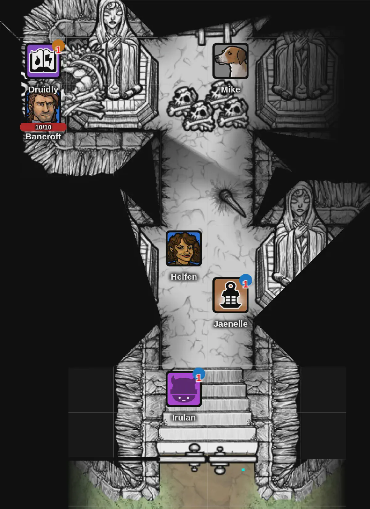 Druidly and Bancroft proceeded deeper, closing the entrance to the rats’ lair. While Druidly searched for something to plug the pipe trap on the statue, Bancroft braced the rat trap door with scorpion viscera.