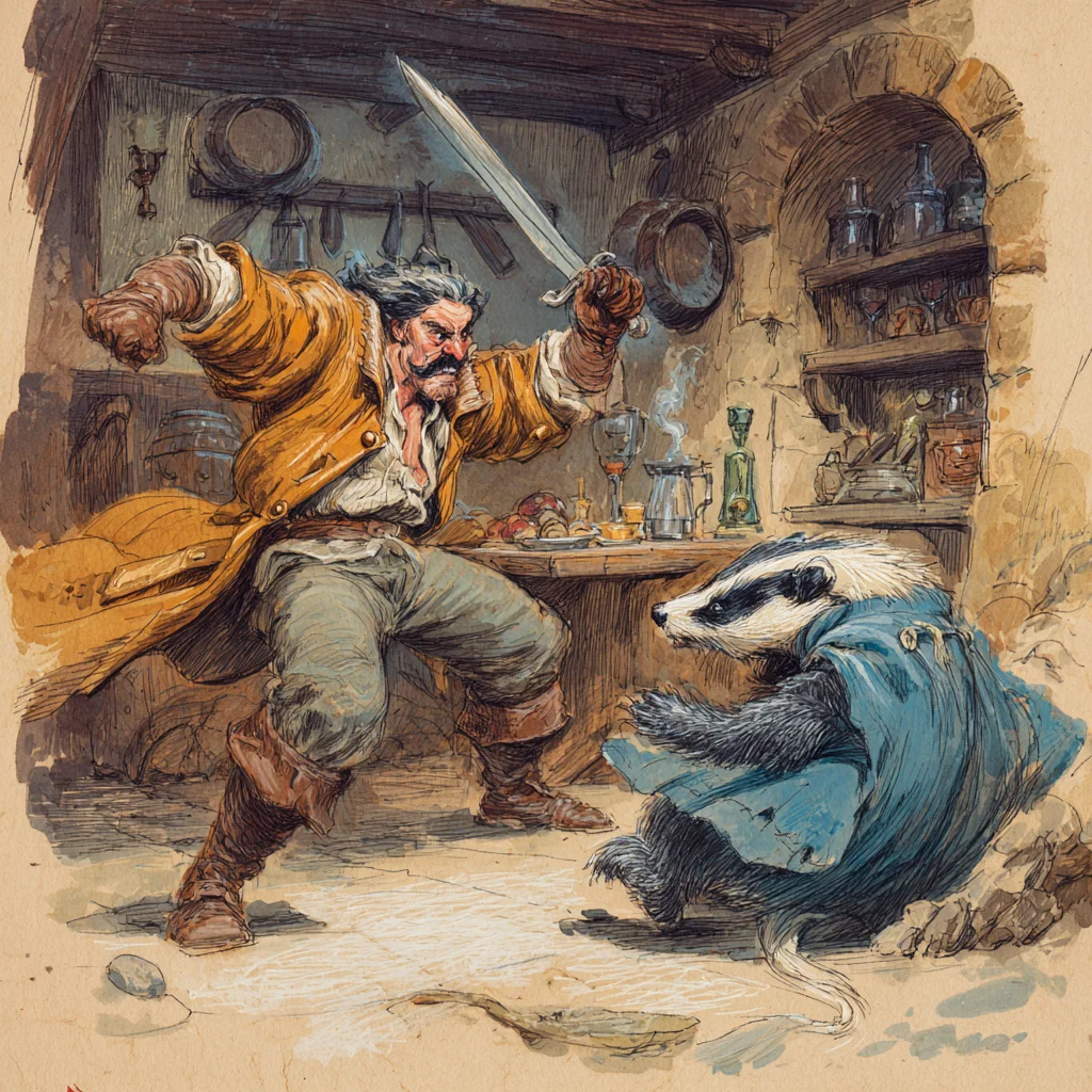 The only clue was a ragged scrap of leather around the badger’s neck, perhaps the remnant of a collar, and the broken window. Regardless of the circumstances, the badger was pissed and dealt Bancroft a nasty bite. He fled out of the room, naked, with only his sword, gasping a quick prayer for healing. The badger pursued, chewing the door to bits. Bancroft fled again to the inn’s common room, praying once more that Sylvanus would ease the badger’s wrath.
