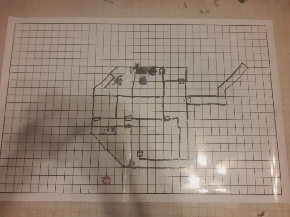 Undaunted, though, the party continued onwards. The bedroom contained another hidden door, this one leading to a library with a strange statue in the middle of the room, holding a hammer. Warin stepped forward into the room, and the statue suddenly came to life, throwing it’s hammer at him. He was knocked unconscious by the blow and the party dragged him back out.