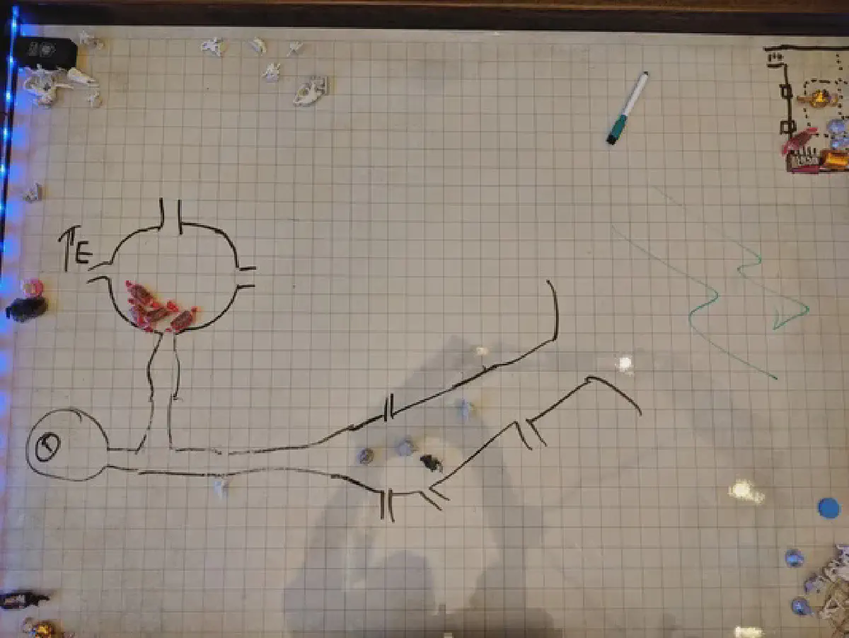 Having discovered some coin in a drawer in the altar, we took to the trap door. No stairs, so I dropped a long beam vertically, while a rope was dangled. Working down the ~20 feet was no issue. Once down, we found ourselves at a branch. Walking past the first turn, we continued straight, but it appeared the path was too narrow for most of us (perhaps Pryz may have fit?). Instead, we backed up, and took the left turn. Not far down the 'hall', Pyrz and I stumbled into a large, submerged pit. The liquid was not water, however, but some form of a weak acid. It was painful to the skin, and clearly a threat to gear. While attempting to stand, we were attacked by human-sized larvae, pale and disgusting, clearly accustomed to the dark. Recognizing this wasn't a defensible position, Pryz and I backed up onto dry land (as much as anything is dry down here), and attempted the previous route. While we were backing up, Warrin and Leah announced that giant ants had engaged them from the opposite end. The two were able to hold their own, with Leah exterminating several of them, before we all converged back near the rope (and a ladder we'd initially missed). A bottleneck created, Pyrz, Leah, and Warrin were able to withstand wave after wave from the ants, before finally eliminating them all. We've now moved into the cavern from which the ants emerged, and found it empty, with small passages to the side. Cautiously, we're taking a moment to collect ourselves before proceeding. Barron is still out there, and he must be recovered.